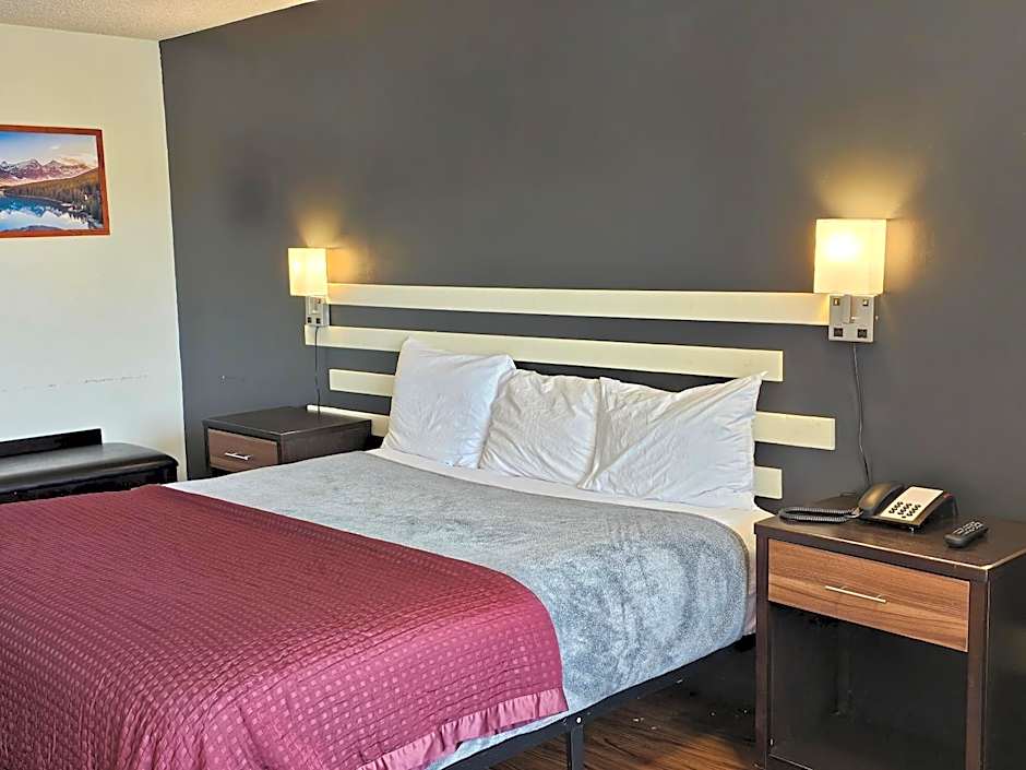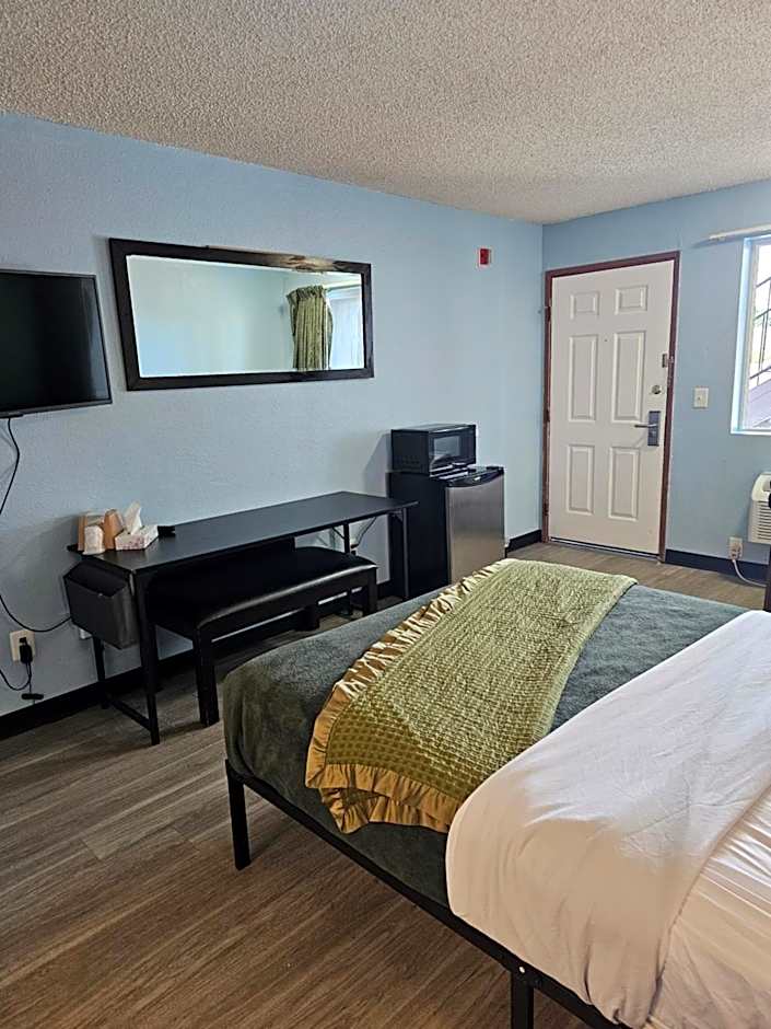 Room includes a flat-screen TV, a refrigerator and a microwave.
